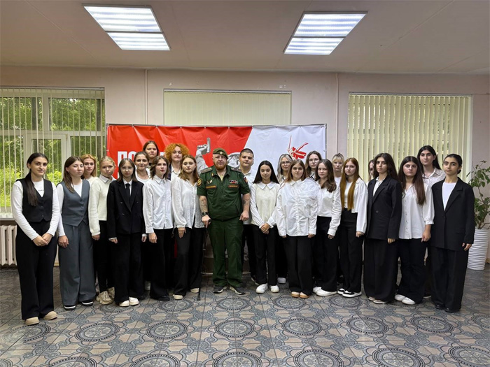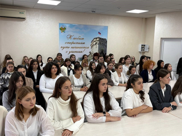 На кануне празднования воссоединения Донбасса и Новороссии с Россией в филиале Ставропольского государственного педагогического института в Железноводске прошла встреча студентов с участником специальной военной операции Тарасовым Константином Витальевичем.