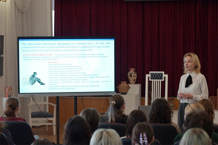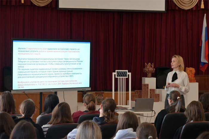 Лектор рассказала о работе сотрудников ФСБ России по пресечению подрывной деятельности украинских спецслужб, направленной на вовлечение в преступные схемы детей и молодежь. Студентам наглядно объяснили: неотвратимость наказания за террористические деяния — это не просто юридическая формулировка, а суровая реальность.
