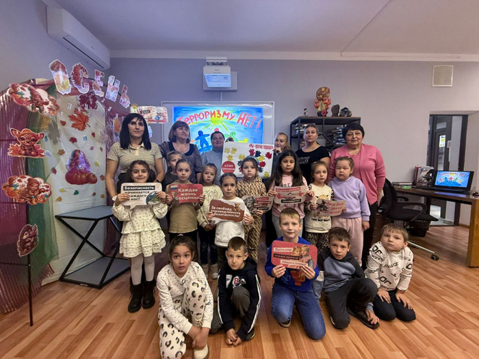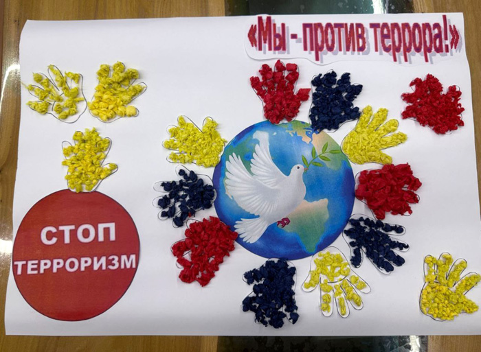 Вместе с организаторами мальчишки и девчонки посмотрели мультфильм по противодействию терроризму «Зина, Кеша и террористы», а в завершении мероприятия изготовили коллективную работу в технике аппликация «Мир без террора».
