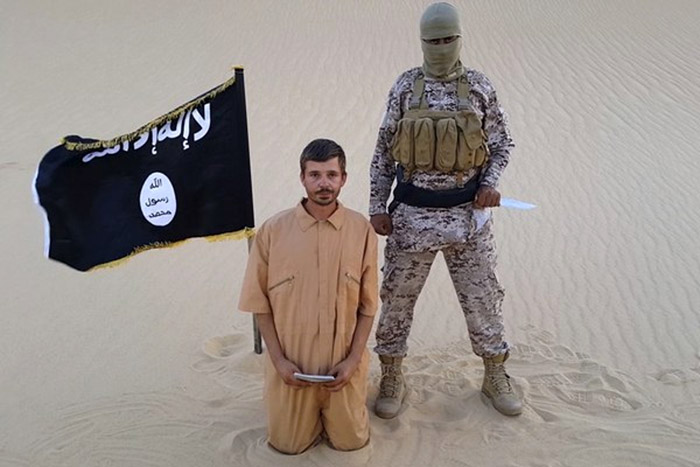 Перед ними на животе лежит мужчина. Его руки связаны за спиной. Мальчик за волосы поднимает голову мужчины. Сильным движением он вонзает лезвие в горло мужчины. Нажимает на нож и режет. Из перерезанного горла льется кровь, вываливаются жилы и мышцы. Мальчик продолжает резать. В нескольких шагах от него стоит и смотрит взрослый боевик ИГИЛ (организация запрещена в России — прим. ред.). Мальчик поднимает окровавленную отрезанную черноволосую голову мужчины.